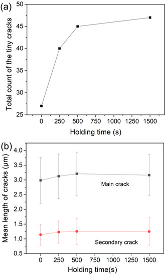 (a) Total count of secondary cracks; (b) mean lengths of the main and secondary cracks under different holding conditions.