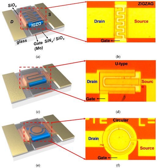 Schematic cartoons for the device configuration corresponding to (a) zigzag, (b) U-type, and (c) circular amorphous indium–gallium–zinc oxide (a-IGZO) thin film transistors (TFTs) and their optical microscope images for the implemented (d) zigzag, (e) U-type, and (f) circular a-IGZO TFTs, respectively.