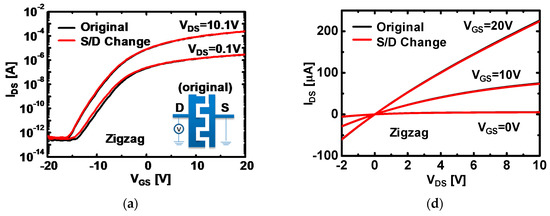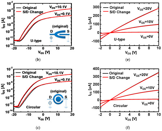 Transfer characteristics of (a) zigzag, (b) U-type, and (c) circular-type a-IGZO TFTs depending on bias configuration. The original is the bias configuration as shown in the insect. Source and drain (S/D) change is a reversed S/D configuration for the same bias value. Output characteristics, corresponding to each channel shape of (c) zigzag, (d) U-type, and (e) circular-type a-IGZO TFTs according to bias configuration. The channel width and length for a-IGZO is 200 and 4 μm, respectively.