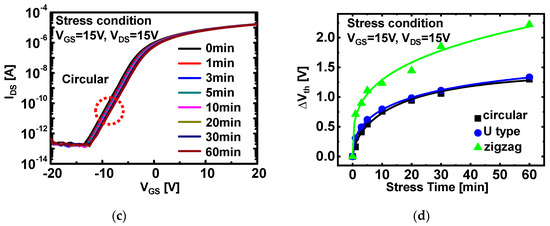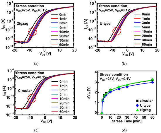 Transfer characteristics of (a) zigzag, (b) U-type, and (c) circular a-IGZO TFTs under bias stress condition of VGS = 15 V and VDS = 15 V. All of the bias stress tests were executed under 60 °C substrate temperature for 60 min. (d) Evolutions of threshold voltage shift depending on bias stress time under stress condition of VGS = 15 V and VDS = 15 V.