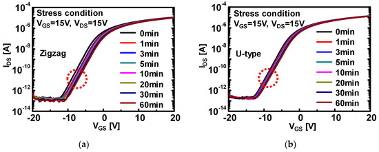 For analytical understanding of device instability, the model of ∆Vth by the charge-trapping mechanism was employed in this study. The stretched-exponential equation for the ∆Vth is defined by the following equation [25,33]: