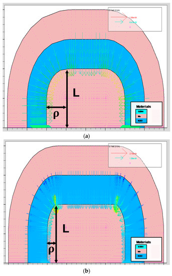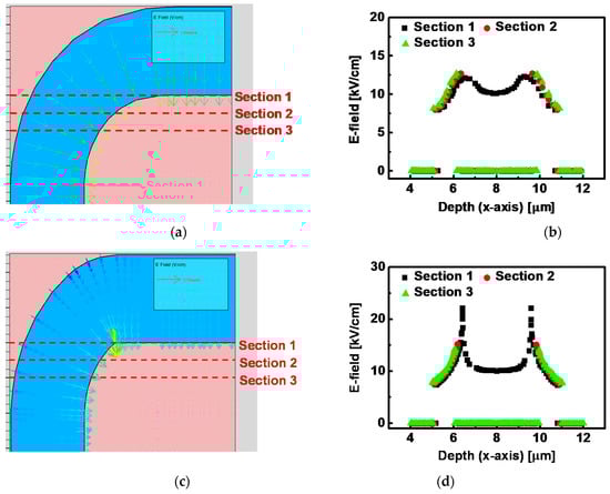Enlarged device structure and extracted E-field distribution near the corner region with (a,b) larger ρ (round corner), (c,d) small ρ, and (e,f) ρ = 0 (perpendicular corner).