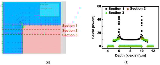 For the better understanding of E-field enhancement depending on channel shape, Technology Computer Aided Design (TCAD, Silvaco Inc.) simulation was employed to analyze E-field distribution in the channel in a quantitative mode [34]. Figure 5a–c shows simulated results with device structures depending on different ρ values. In Figure 5, the pink region is the S/D electrode, the blue region is the channel area, the arrow is E-field, and L is the length of electrode. Furthermore, ρ indicates the hemisphere radius, thus, a long ρ represents spherical corner shape at the channel/electrode boundary and a short ρ represents perpendicular corner shape. In Figure 5a, the device with circular corners shows identical color (i.e., identical magnitude of E-field) along the channel region. However, when the ρ is shortened and the corner becomes stiff, E-field is concentrated on the corner region and its magnitude is increased in Figure 5b. Furthermore, when ρ becomes zero as shown in Figure 5c, the E-field is more sharply focused on the corner than in Figure 5b. To quantitatively confirm its effect, enlarged images of simulation and E-field values along the channel toward the x-axis direction were presented in Figure 6. Figure 6a shows an enlarged one-side corner of the structure from Figure 5a. To closely see the difference of E-field between the corner and the common region, scanning areas are divided into three sections. For all of the sections, Figure 6a,b exhibit a relatively uniform distribution of E-field from 8 to 13 kV/cm along the channel. (The data of E-field = 0 indicates the measuring point is in the metal electrode region.) However, in Figure 6c,d, a highly enhanced E-field at Section 1 was shown with a value of 22 kV/cm at both corners. And for Section 2 and Section 3, which are slightly separate from the corner, the E-field is analogous to results from Figure 6a,b, indicating E-field is concentrated at the corner region. In the case of a device structure with ρ = 0, as shown in Figure 6e,f, E-field at Section 1 shows a remarkable increase with the value of 45 kV/cm at both corners, which is four-times larger than it is at Section 3. This result indicates the perpendicular shape of the corner induces more E-field enhancement than the spherical shape, thus, the E-field enhancement is directly associated with value of ρ For the confirmation of ρ dependency, E-field at Section 1 depending on various ρ was extracted in Figure 7. Similarily, the results of Figure 6 and Figure 7a show the two highest E-field peak at both corners. Its maximum value at the corner was gradually increased as ρ decreased. The detailed extracted E-field values depending on ρ were presented in Figure 7b. This result can be meaningfully when combined with results of bias temperature stress instability. In the device structure, ρ is calculated as 1.18 μm for zigzag-type a-IGZO TFTs and calculated as 3.09 μm for U-type a-IGZO TFTs, thus, it is expected to have larger E-field enhancement for the zigzag-type a-IGZO TFTs than the U-type device. Since zigzag-type a-IGZO TFTs show a larger Vth shift than U-type device in Figure 4 and Figure 5, this expectation from TCAD simulation is well matched with experimental results. All of the results in this section substantiate the presence of E-field enhancement at the corner region of the channel, and its variation depending on hemisphere radius ρ.