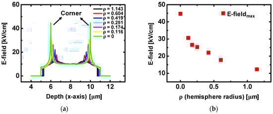 (a) E-field variation at Section 1 depending on hemisphere radius (ρ) of the channel. (b) Extracted maximum E-field values at the different hemisphere radius.