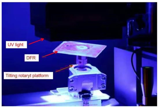 In this process, SUEX Dry Film Resist (DFR) replaces the traditional SU-8 photoresist, the thermal lamination process replaces the original silicone technology. DFR is directly adhered to the glass substrate, thereby saving time and efficiency. Moreover, the thickness of the DFR is given, and it is not necessary to adjust the complicated tannin parameters, and the thickness of the DFR used in this experiment is 250 μm. During exposure, the tilt angle of the rotating platform was set to 18°, the platform rotation speed was 400 rpm/min, and the exposure time was 70 s. The lithography mask used in the experiment was a film version with a circular diameter of 75 μm, a center distance of 300 μm, and a density of 35 × 35 needles per square centimeter.