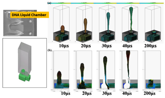 The diameter of the ejection outlet was 60 μm. The thickness of the ejection orifice (volcano) was 50 μm. The process thickness of the dry film layer was 60 μm. The bottom design of the ejection cavity was 120 μm × 120 μm. The area of the heater was 105 µm × 105 µm. Under the operating frequency of 5 KHz, the 3D side view and the X-Z two-dimensional (2D) section view were analyzed. Simulation spraying was conducted for 10, 20, 30, 40, and 200 µs. This simulation calculated the area of the top of the thermal resistance. Initially, the mean droplet tip speed was estimated at 10 m/s, and the length of the tail of a droplet was approximately 300 μm. A 200-μm X-Z section view revealed the simulation results. The liquid clearly reached the fluid outlet. The liquid was in a stable state, indicating that the liquid had filled up the cavity as expected. The cavity had a uniquely designed shape. The simulation results revealed the behavior of the geometric shape of the 3D ejection cavity. The simulation results under a 5-kHz operating frequency revealed no shortage of DNA liquid. Therefore, the tail of the DNA droplet had the lowest quality and was easily affected by the asymmetry of the flow field force, resulting in an off-track flying trajectory.