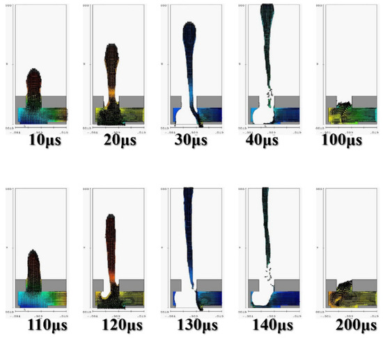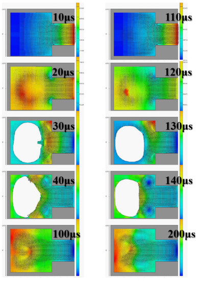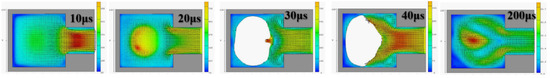 Figure 6 illustrates the injection cavity height as 60 μm and 30 μm and reveals the 2D X-Y cross section. At 100 μs and 200 μs, the fluid injection orifice did not completely fill the chamber. In those stages, the fluid was still filling the chamber, and the flow field was not yet stable.