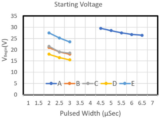Figure 8 depicts the starting voltage graphs of Type B and Type E chips. The nozzle density of these two chips was 50, and their resistance was 35 Ω. As the pulse width increased, the starting voltage of Type B and Type E chip decreased. From the energy perspective, an increase in pulse width increased the required energy (