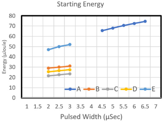 Figure 9 reveal the starting voltage and energy of the Type A chip, respectively. That chip was designed using dual heaters in series. The figures reveal that the starting voltage of the chip decreased as the pulse width increased. From the energy perspective, an increase in pulse width increased the required energy.