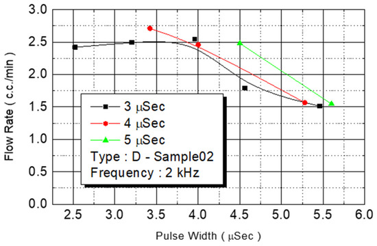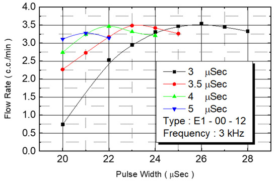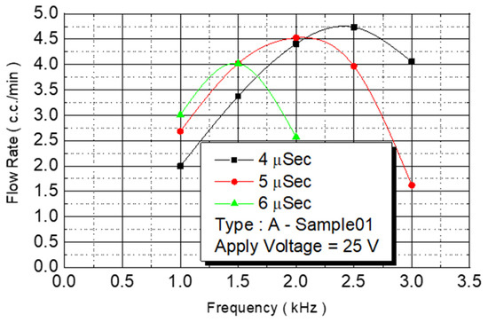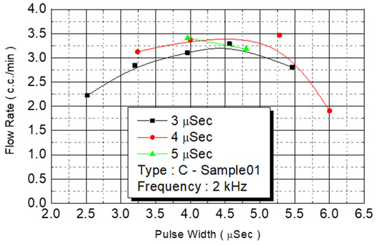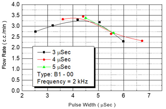 We observed flow performance under various pulse widths under 20 V of driving voltage. As the pulse width increased from 3 μs to 3.5 μs, 4 μs, and to 5 μs, the corresponding flow rate increased from 0.75 cc/min to 23 cc/min, 2.7 cc/min, and to 3.1 cc/min.