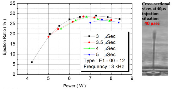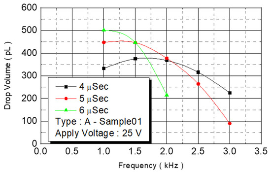 Figure 11). The volume of the spray dots increased from 330 pl under a pulse width of 4 μs to 500 pl. At 6 μs, the volume increased with the pulse width. The ejection rate of the ejection point’s volume, in contrast to the chamber capacity, increased from 40% to 58%. The experimental results indicated that an increase in energy increased the pressure of bubbles and more liquid was expelled.