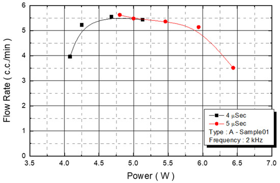 We observed the flow rate changes under various power conditions, with an operating frequency of 2 KHz and a pulse width of 4 and 5 μs. With power ranging from 4.3 W to 5.7 W, the flow rate of the injected monomer was 5.5 cc/min (