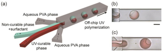To date, monodisperse Janus droplets comprised of two miscible [7] or two immiscible segments [8] have been produced via droplet microfluidics. While the two miscible segments tend to be mutually mixed over time through convective and diffusive transport, Janus droplets of two immiscible segments can maintain their phase-separated geometry via the minimization of interfacial free energy. For example, monodisperse Janus droplets with mutually immiscible curable and non-curable segments have been produced as templates for fabricating lens-shaped polymer particles for use in microoptics applications [9,10,11]. One approach to produce Janus droplets of two immiscible segments via microfluidics is solvent-evaporation-induced phase separation within a droplet [12]; however, this is a time-consuming process, and a suitable co-solvent is needed. Another approach is to form a two-phase parallel stream by infusing two immiscible droplet phases separately, and subsequently emulsifying it by the coflowing continuous-phase stream, using microfluidic droplet generators such as a T-junction [13], flow-focusing geometry [8,9,10,11], and assembled microcapillaries [3,14].