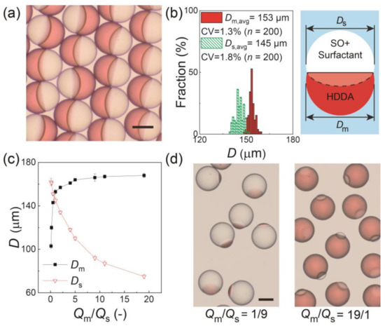 Figure 2a shows the surfactant-laden Janus droplets produced at Qm/Qs = 1/1 and collected on a glass slide. All the droplets had a snowman-like Janus geometry with a concave-convex HDDA segment and biconvex SO segment separated by a curved inner interface. The aperture diameters of the HDDA (Dm) and SO (Ds) segments were measured, and they had narrow size distributions with coefficient-of-variation (CV) values of approximately 2% (Figure 2b), indicating that the droplets were highly monodisperse. The aperture diameters could be controlled by changing the Qm/Qs. As Qm/Qs increased from 1/9 to 19/1, the sum of Qm and Qs remained constant (0.6 mL h−1), Dm increased from 103 to 168 μm with the CV in the range of 1.0% to 2.2%, and Ds decreased from 162 to 75 μm with the CV in the range from 0.8% to 2.4% (Figure 2c,d).
