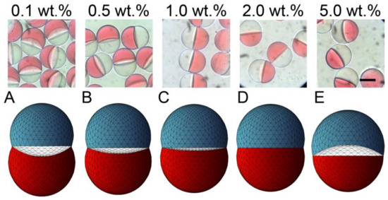 Different Janus morphologies were observed when we varied the concentration of the surfactant in the SO phase in the range from 0.1 to 5.0 wt.% under the same flow condition (Figure 3 and Figure S1b–e). Typically, the increase of surfactant concentration in the SO phase led to the curvature variation of the inner HDDA/SO interface, causing a variation in the shape of the HDDA segment from concave-convex to biconvex, and that of the SO segment from biconvex to concave-convex. When the surfactant concentration in the SO phase was low (0.1, 0.5, or 1.0 wt.%), the HDDA and SO segments of the droplets produced at Qm/Qs = 1 were in concave-convex and biconvex shapes, respectively (Figure 3A,C). At 2.0 wt.%, the two segments became hemispherical with the planar interface (Figure 3D). At 5.0 wt.%, biconvex HDDA and concave-convex SO segments were obtained (Figure 3E). These experimental results agree well with the modeled shapes.