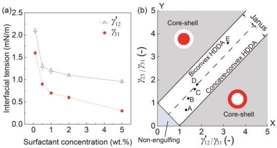To better understand the effect of surfactant concentration on the variation of Janus configurations, we plotted the conditions under different surfactant concentrations (Figure 3A–E) on a phase diagram that can theoretically estimate the possible morphologies of a biphasic droplet (i.e., core-shell, Janus, and non-engulfing states, Figure 4b) based on the interfacial tensions [9,25]. The white region in the middle of the diagram shows a Janus morphology, where the biconvex HDDA and concave-convex SO segments form above the Y = X line, and the concave-convex HDDA and biconvex SO segments form below the Y = X line. The HDDA/SO interface becomes planar if the condition is on the line of Y = X. As shown in the phase diagram, all the experimental conditions (A–E) plot in the Janus region, with A, B, and C are in the region for the concave-convex HDDA segment, D nearly on the line of Y = X for the planar HDDA/SO interface, and E in the biconvex HDDA region. These results are in good agreement with the experimental results (shown in Figure 3). Thus, we can visualize how droplet morphology changes when we increase/decrease the surfactant concentration.