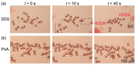 To illustrate this point, we measured the three interfacial tensions and calculated the three spreading parameters. In our previous study without a surfactant, we obtained γ31 = 2.2 mN m−1, γ12 = 10.8 mN m−1, and γ23 = 1.1 mN m−1, thereby causing S1 < 0, S2 < 0, S3 > 0, forming a core-shell structure [21]. Meanwhile, in this study, when we used the SO containing the surfactant at 0.1 wt.%, the average values and standard deviation of the measured interfacial tensions were γ31 = 1.63 ± 0.07 mN m−1 and γ12 = 9.61 ± 0.06 mN m−1, while γ23 maintained a similar value of 1.13 ± 0.02 mN m−1 (n = 5, Figure S3). These values correspond to the core-shell condition (S1 < 0, S2 < 0, S3 > 0), which is inconsistent with the Janus morphology we confirmed in this study. One possible reason for this discrepancy is that there might be some HDDA molecules at the interface between the SO and the aqueous PVA phase, reducing the interfacial energy at the SO/water interface [8]. This reduced interfacial tension (γ′12) was estimated using the following equation [24]: