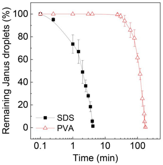 To further validate the stability of these Janus droplets, we extended the time of observation and counted the number of remaining Janus droplets over time, as shown in Figure 6. The number of surfactant-free Janus droplets in the SDS solution rapidly decreased over time, and all of them ruptured within ~4 min. In contrast, for the surfactant-laden droplets, no coalescence was observed for ~24 min, and it took ~176 min for all the droplets to lose their Janus morphology.