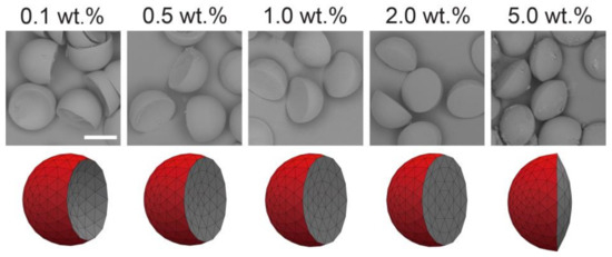 Polymer particles of various lens shapes were prepared from the surfactant-laden Janus droplets shown in Figure 3 via off-chip photopolymerization (Figure 7). We confirmed that the fabricated particles reflected the shape of the curable HDDA segment in the precursor Janus droplets, which were concave-convex, planar-convex, and biconvex shapes based on the concentration of the surfactant in the SO. From the precursor droplets carrying the surfactant at lower concentrations (i.e., 0.1, 0.5, and 1.0 wt.%), concave-convex particles with different curvature radii of the concave surface were obtained; more concave surfaces were observed for the particles with lower surfactant concentrations. Surfactant concentrations of 2.0 and 5.0 wt.% yielded planar-convex (i.e., hemispherical) and biconvex particles, respectively. We confirmed similar shape variation from concave-convex to biconvex when the droplets produced at Qm/Qs = 1/2 and 2/1 were solidified, although the transition of the inner curvature between concave and convex surfaces was at 1.0 wt.% for Qm/Qs = 1/2 and 5.0 wt.% for Qm/Qs = 2/1. All the shapes of the particles agreed well with the shape of the HDDA segments in the precursor droplets as well as the results predicted by modeling (Figure S7).