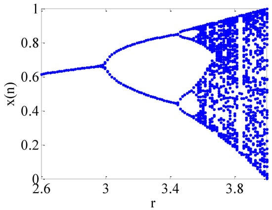 where the range of control parameter r is , and the state value for each iteration is . The initial value of the iteration is . When the control parameter r changes, the behaviour of the logistic map will be very different. Figure 1 depicts the bifurcation diagram of the logistic map when the initial value is 0.45. It describes the distribution of the iteration values as a function of the parameter r. The abscissa is the parameter r, and the ordinate is the iterative state value . When parameter r increases, the mapping iteration motion will appear in multiple states. When , the values of will be distributed within a certain range, and there is no fixed period. In the meanwhile, the logistic map exhibits a chaotic state.