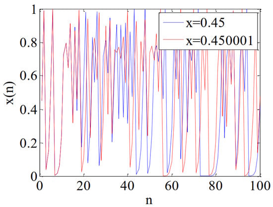 The chaotic map is highly sensitive to the initial value []. The logistic map is iterated 100 times when the control parameter r is 4, and the initial values are and . The results are shown in Figure 2, and it demonstrates the initial condition sensitivity of logistic map. The two chaotic systems are only with extremely small differences in initial values. In the iterative process, the errors are rapidly amplified and the trajectories become irrelevant, which make it extremely difficult to crack the logistic map based encryption system.