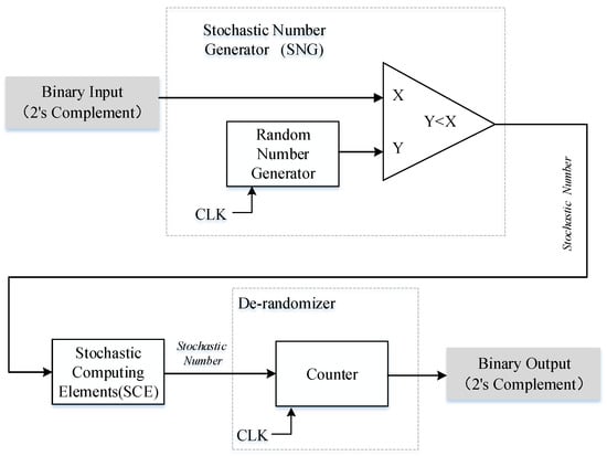 The architecture of SC is shown in Figure 3, which usually consists of three main components: stochastic number generator (SNG), stochastic computing element (SCE), and a de-randomizer []. The SNG is implemented by using a random number generator and a comparator. On the FPGA platform, we can use a linear feedback shift register (LFSR) instead of the random number generator. SNG is used to convert the binary value into random bit stream. At the same time, a de-randomizer of a binary counter is usually used to decode the output stochastic bit stream into a deterministic binary number []. The SCE is an arithmetic operator part of SC, such as multiplier, adder or subtractor. In this section, only unipolar SCE is introduced, because this article only uses a unipolar operation. The circuit structure of SCE is shown in Figure 4.
