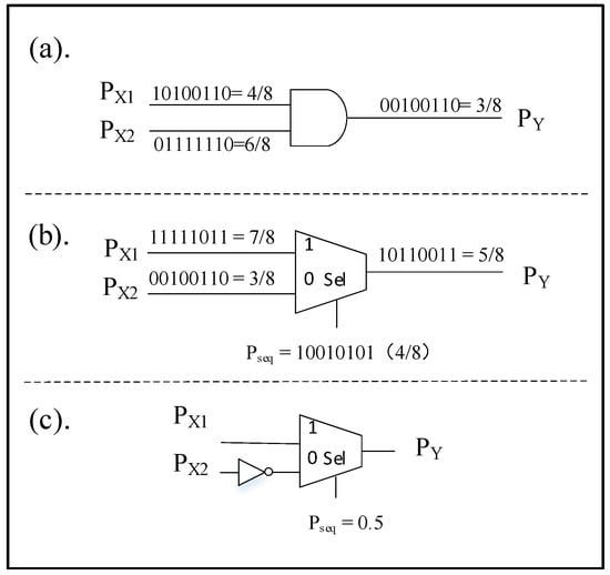 The basic rule of SC is that the calculated data are presented in a stochastic bit stream, and then the data are processed in the form of digital probability. There are two representations for converting traditional numbers to a stochastic bit stream: unipolar and bipolar []. The number range of unipolar representation is [0, 1] and bipolar is [−1, 1]. In SC, the number represented by the stochastic bit stream is replaced by the probability of occurrence of “1” in this bit stream. For example, three different stochastic bit streams (1,0,0,0), (0,1,0,0) and (0,1,0,0,0,1,0,0) in unipolar. In the representation, the number 0.25 is indicated. For example, there are three different stochastic bit streams (0,0,1,0), (1,0,0,0) and (1,0,0,0,0,0,0,1), and they all represent the number 0.25 in unipolar notation. These bit streams represent the number −0.5 in bipolar. The number represented by the unipolar stochastic bit stream can be expressed by the following formula: