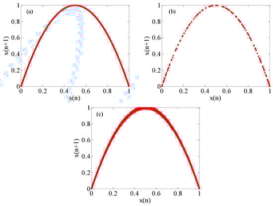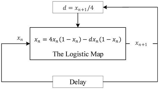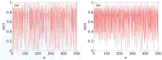 The one-dimensional logistic map [] is a nonlinear discrete system, which is easy to be implemented in hardware due to its simplicity. It is one of the most widely used chaotic maps. Its iterative equation is defined by