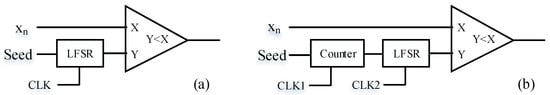 Considering the complexity of hardware implementation, SC is used in this paper to replace the arithmetic unit of traditional digital circuits. In the SC, it is first necessary to convert the fixed-point fraction to the stochastic number through SNG. The structure of the SNG is shown in Figure 6. Figure 6a shows the structure of a conventional SNG. is a fixed-point number, and it is compared with a LFSR which has the same number of bits. If the value of the LFSR is greater than , the value of the stochastic sequence at the current time is 1, otherwise, it is 0. Finally, a complete stochastic number is generated. Figure 6b shows the improved SNG structure. When the rising edge of is detected, LFSR generates a stochastic number. The seed of the LFSR is set to be variable. After the LFSR runs for one cycle, the becomes high, and value of the seed is increased, . Even if the chaotic system generates the same iteration value, the stochastic number of SNG conversion will not be the same. The above operation acts as a minor disturbance to prevent chaotic systems from falling into a short cycle.