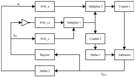 The hardware structure of the enhanced logistic map is shown in Figure 7. The implementation accuracy is determined by the period length of the LFSR. In Figure 7, a NOT gate is added between and input , and the resulting stochastic number represents . produces a stochastic number . Counter represents a decoder in SC that converts a stochastic number into a fixed-point fractional form. The function of Shifter1 is to shift the value of to the left by two bits. Then, the final output value is obtained by subtracting the output value of Shifter1 from the output value of counter1. The function of Shifter2 is to right shift by two bits. The output value is in the range of (0, 0.25), and it will be used as the control parameter d for the next iteration.