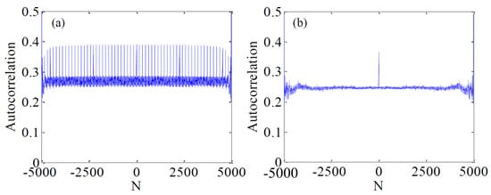 Autocorrelation comparison based on different logistic maps. (a) The original logistic map; (b) The enhanced logistic map.
