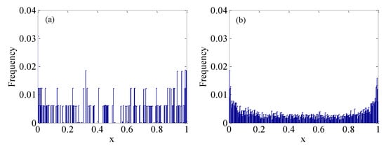 Histogram comparison based on different logistic maps. (a) The original logistic map; (b) The enhanced logistic map.