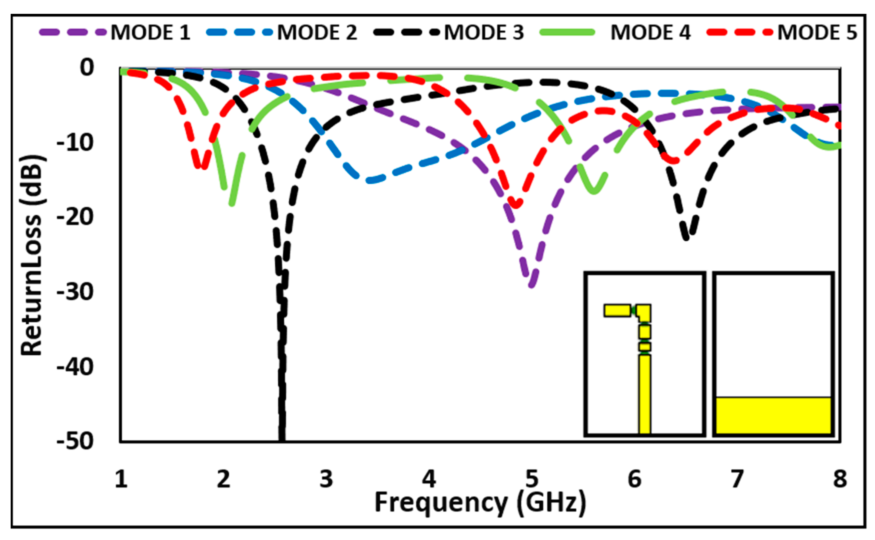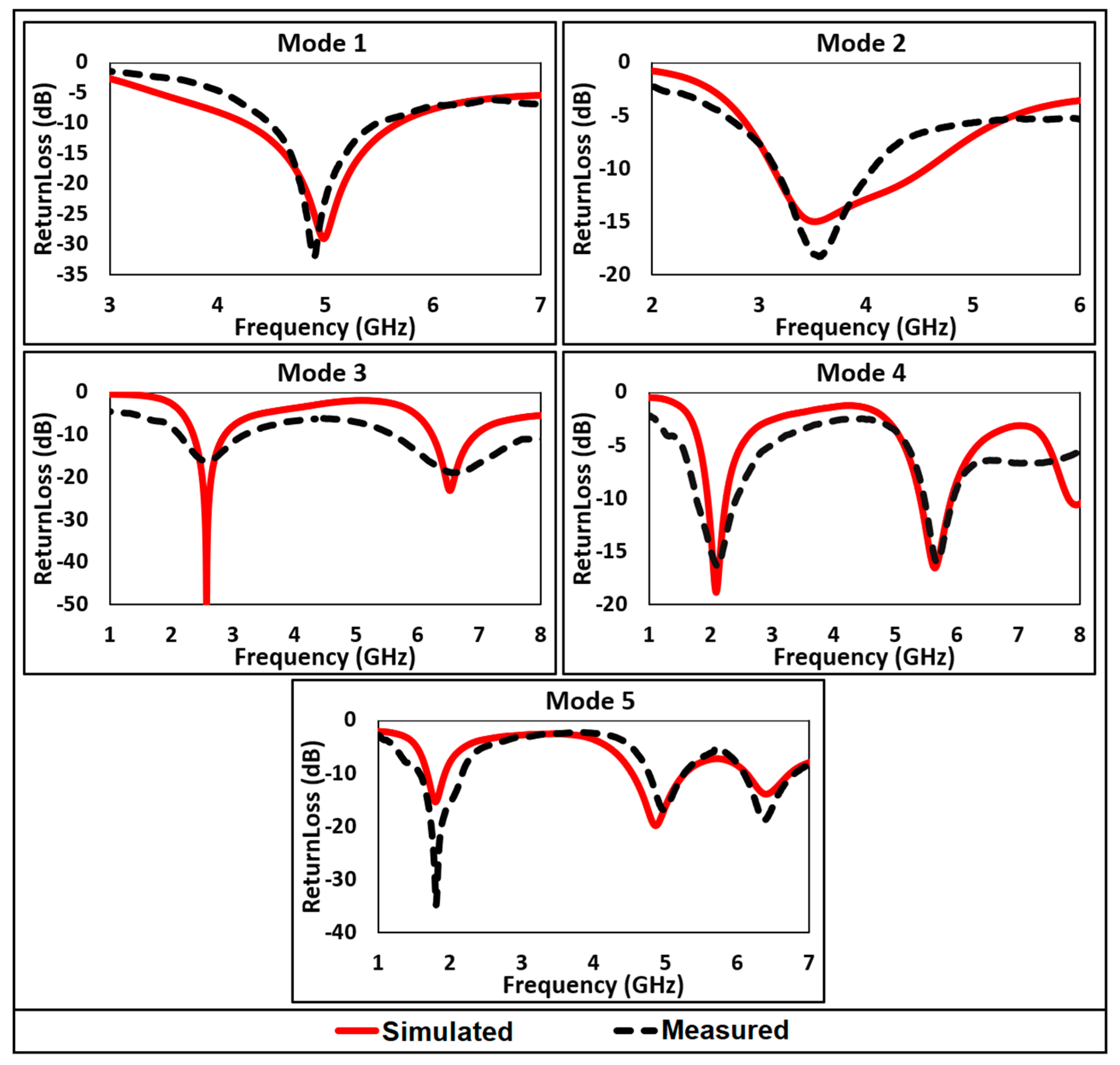 | Mode No | Conditions | Operating Freq (GHz) | −10 dB BW (MHz) | Gain (dBi) | Return Loss (dB) | Radiation Efficiency (%) |