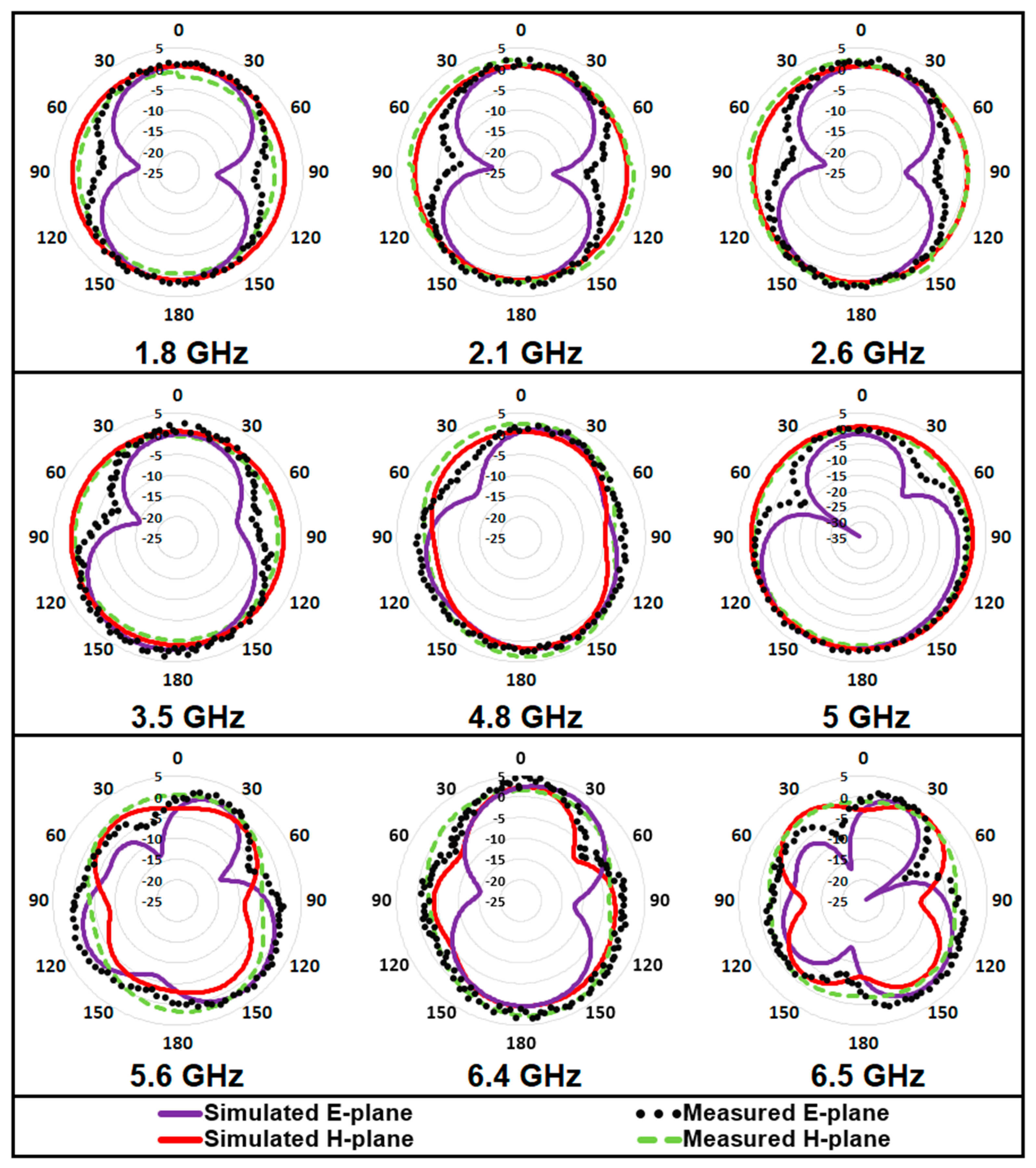 - Ullah, S.; Shaheen, A.; Khan, B.A.; Flint, J.A. A multi-band switchable antenna for Wi-Fi, 3G Advanced, WiMAX, and WLAN wireless applications. Int. J. Microw. Wirel. Technol. 2018, 10, 991–997. [Google Scholar] [CrossRef]