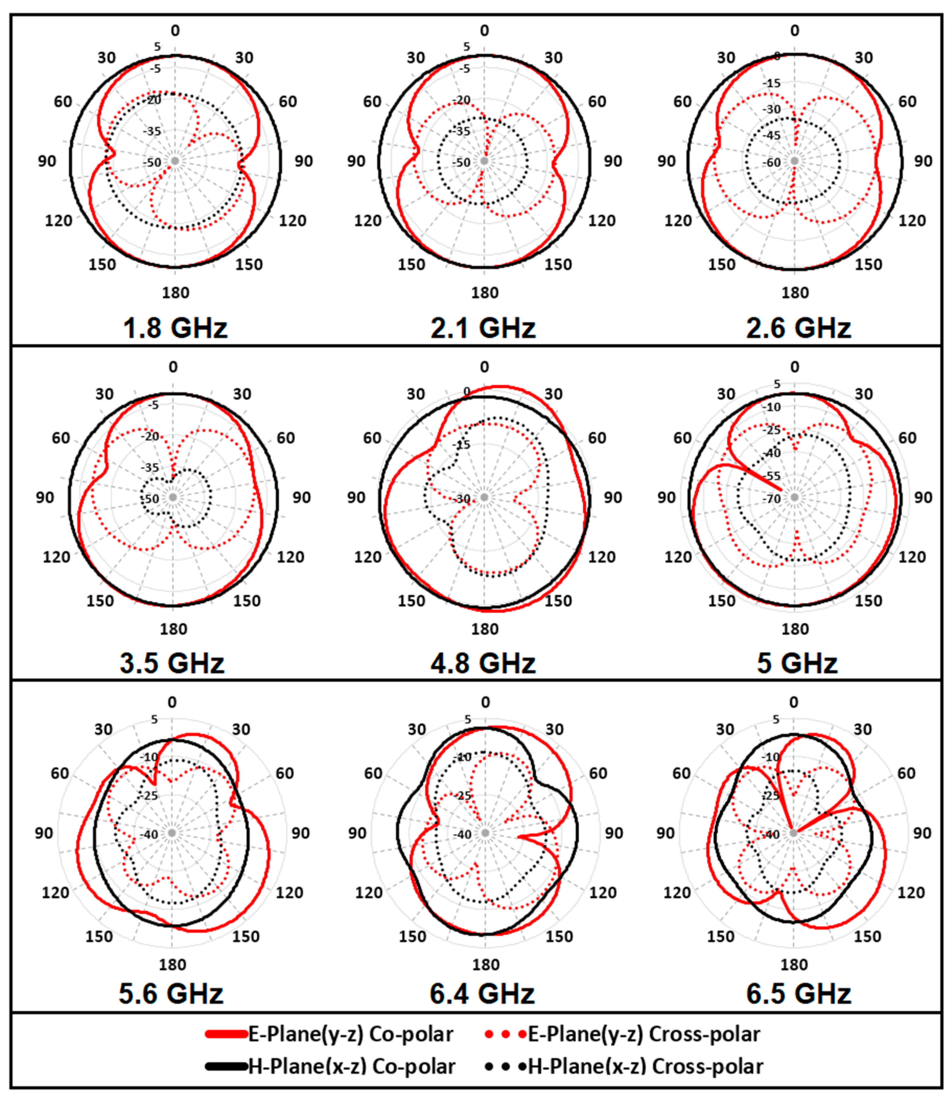 | Ref. | Dimensions (mm3) | Total No of Operating Bands | Operating Frequencies (GHz) | Bandwidth (MHz) | Peak Gains (dBi) | Radiation Efficiency (%) |