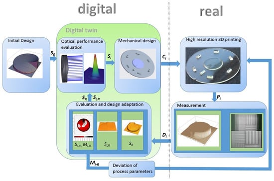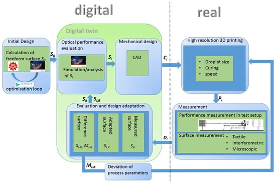 Additive manufacturing (AM) offers great freedom in design, a short lead-time, and the possibility of functional integration [1]. AM technologies can be divided into seven main categories [2,3], including 3D ink-jet printing. In 3D-ink-jet printing, ink droplets are deposited and cured, layer by layer, by UV illumination. The ink may be polymer or hybrid polymer (e.g., Ormocer (R)) based. Moreover, metal or ceramic nanoparticle-enhanced polymer inks continuously increase the application range of 3D-ink-jet printing. Ink rheological properties, piezo waveform, and nozzle shape are important parameters for droplet generation. Upon droplet impact on the substrate or on previously printed layers wetting behavior, droplet size, droplet overlap, droplet coalescence, and UV-curing strategy govern layer formation. A considerable amount of research has gone into developing an understanding of these complex interrelations between materials, equipment, and printed shapes. Though 3D printing was originally primarily used for prototyping, it has evolved to be used for the custom mass production of functional parts [4,5] and is used in several industrial fields, e.g., automotive, aerospace, and medical, as a well-established alternative to conventional manufacturing processes [6,7,8,9]. The potential of high-resolution 3D printing to produce parts with a high degree of design freedom makes this technology interesting for optical applications where an increasing use of optical freeform surfaces can be observed. Optical applications using freeform optical surfaces include automotive lighting [10,11], beam expanders [12], and ophthalmic implants [13,14,15]. The established processes to manufacture freeform optical components from optical polymers are the direct diamond turning of the optical component [16] and the diamond turning of a mold insert for precision injection molding [17]. High-resolution 3D printing, with its enormous flexibility in terms of shape variation, opens up great potential for creating new approaches and solutions for optical systems [18]. The manufacturing of optical components and, especially, freeform surfaces has to meet high requirements, e.g., the high fidelity of the optical surfaces. Macroscopic imaging freeform optics pose great challenges for high-resolution 3D inkjet printing with regard to shape fidelity [19]. There are only few companies mastering the above-mentioned complex set of 3D-inkjet printing to a degree that optical surface can be realized. This process know-how is their competitive advantage and thus, understandably, not disclosed to the public. For the performance prediction of the manufactured freeform optics in an optical system, the use of measurement data of the manufactured parts to enhance the optical model with respect to realistic representation of the optical surfaces as manufactured is a useful strategy [20]. Detailed comparisons of nominal freeform surfaces with tactile measurements of freeform surfaces produced by 3D inkjet printing allow for a better understanding of the 3D inkjet printing process and the derivation of process improvement strategies [21]. Though the term digital twin is versatilely used, there is a basic and common understanding in scientific and industrial publications that a digital twin is a virtual equivalent of a real system [22]. It maps physical objects and does not only describe physical objects but also optimizes physical objects based on models [23]. This article presents the development of a digital twin on the basis of the above-described approach to adapt the high-resolution inkjet printing process to a respective geometry with the objective of increasing the shape fidelity of optical surfaces. Our work was based on an enhancement of the simulation models with data from surface measurements. This allows for the detection of discrepancies in shape fidelity and for the direct determination of the influence of these discrepancies on the optical performance of a freeform component. Hence, the printing process can be adjusted in order to reduce or increase material accumulation or to adjust curing strategies, thus leading to higher-performance components. The organization of the paper is as follows: in Section 2, the digital twin and the process flow are developed. Section 3 introduces the optical system used as an example. The evaluation of the measurements leading to a height map of the difference surface between measured and nominal surface is presented in Section 4. Section 5 is about the model enhancement and the usage of the digital twin in sensitivity analysis. A discussion of the achievements closes this article.
