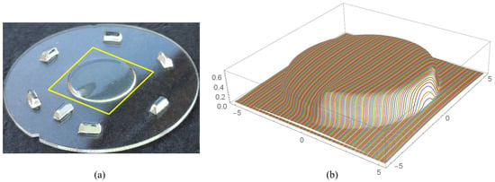 Tactile surface measurements were conducted with a Dektak V220 SI profilometer. The measuring window had a dimension of 10.5 mm × 10.5 mm and encompassed the entire optical aperture (see Figure 5a). In the measurement window, 210 profile lines with 5250 measuring points each were recorded. The path of the measuring tip was chosen to be parallel to the surface discontinuity of the rotation optics. Figure 5b shows a superelevated 3D-plot of the 210 measurement profiles, each containing 5250 data points.