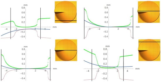 The curvature of the lens bodies depends on the form factor A and the azimuth α, hence featuring a discontinuity at the transition from α = 2 π to α = 0. The left of Figure 3 shows a helical surface calculated with Equation (1): the surface curvature varied from convex to concave, starting with the discontinuity (transition between 2 π to 0) following the azimuth clockwise. The profiles of the surface parallel to the x-axis, along the blue intersection (Figure 3, mid column) and parallel to the y-axis along the red intersection path (Figure 3, right) illustrate the surface sag, which indicates the displacement of the surface along the optical axis (z-axis) of the surface at distance from the axis. Since discontinuity could seriously affect imaging quality, it has to be obscured by a diaphragm to prevent any disturbing effects in imaging, e.g., scattering. A combination of two lens parts featuring such helical surfaces arranged in sequence perpendicular to the optical axis would possess a constant refractive power over the complete aperture. The refraction power could be tuned continuously by mutually rotating the lens bodies around the optical axis (see Figure 4). This optical system is multifocal, with two sectors with different individually tunable refraction powers [21,27].