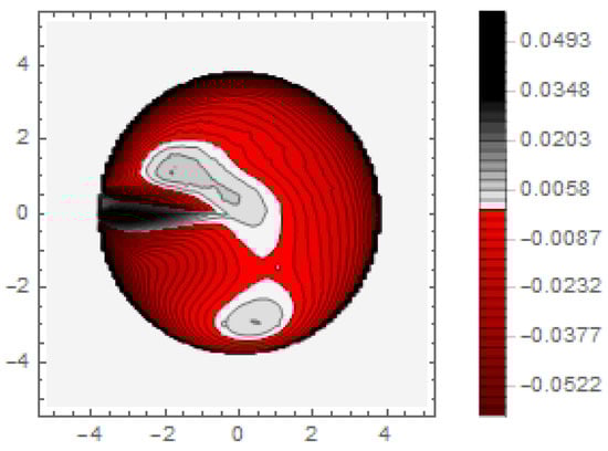 The figure shows nominal profiles (blue), measured profiles (red), and difference profiles (green) inside the limits of the nominal aperture (perpendicular solid black lines). Considering Figure 7, it is apparent that the printed surface did not extend over the nominal lens aperture: the red curves depicted in Figure 7 dropped to substrate level far inside the nominal aperture. The evaluation showed a lens aperture reduced by about 20%. This shape deviation at the edge of the aperture could be corrected directly by adjusting the allowance in the process data. The compensation of the lateral shrinkage for such structures could lead to a design aperture of 125% of the nominal value [21]. Furthermore, strong form deviations could be observed, and these were most pronounced at the transition from convex to concave. These form deviations must be corrected by an adapted control of the high-resolution 3D printing process. To get information of shape deviation over the entire optical aperture, the difference surface is represented as a spatially resolved height map Mi-R (Figure 8). The scale of the height map directly shows the tolerance range with which the respective design could be manufactured by the specific process. Regarding the given case, the tolerance of the surface accuracy was in the range of ±50 µm. However, the height map also quantitatively shows the difference between nominal and measured surface at every surface position. This directly gives information regarding in which areas more and in which areas less material must be deposited; hence, this was a quantitative measure of the surface accuracy of the printing process. The quantitative information of the height map could be used to adjust the parameters of the high-resolution printing by adapting printing speed, drop size, and UV-illumination control for curing and to define an allowance for compensation.