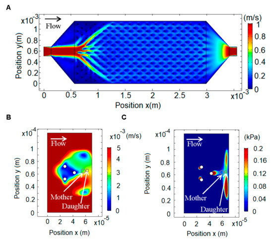 The velocity profile shows that the lowest velocity is in the middle of the pillars, but there is also a low velocity zone to the right of the rightmost pillar (Figure 1B). The pressure profile along a line bisecting the trap shows that in the zone where the mother cells are trapped there is a gradient, which results in a force towards the pillar (to the left), and in the area where the daughter cell is born there is a gradient, which results in a force (to the right) that carries the daughter cell away (Figure 2C).