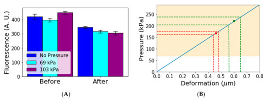 Figure 3B shows the results of the model applied to the available data. The continuous blue line shows the linear relation between deformation and pressure. The yellow area shows the region in which we observed pressure affects gene expression. The highlighted region starts at 69 kPa, but it is possible that gene expression is affected at even lower values. The red and green points show the average values estimated for two other devices found in the literature [16,21]. The dotted lines show the 95% confidence interval for the deformation measurement and corresponding pressure estimate in those devices. We observed that these devices subject cells to pressures that are high enough to affect gene expression.