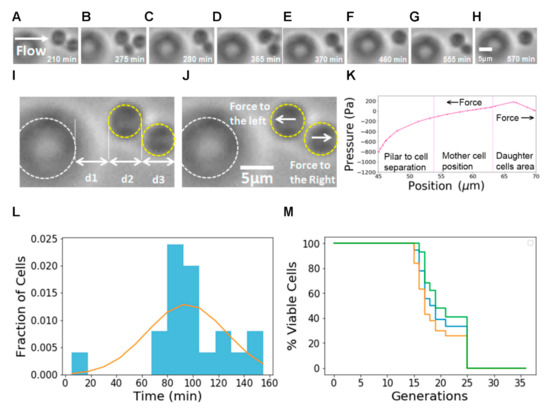 (A–H) Time-lapse Bright Field images (video frames) showing the dynamics of a single mother cell with two daughters. (A) Mother cell with first daughter cell before detachment. (B) Mother cell with second daughter cell. (C) First daughter is detached, and second daughter continues growing. (D) Mother cell with third daughter cell. (E) Second daughter cell is detached, and third daughter cell is still growing. (F) Third daughter cell is detached. (G) Fourth daughter cell growing before detachment. (H) Fourth daughter cell is detached. (I) Pillar and cell position. PDMS pillars are highlighted in white and cells are highlighted in yellow. (J) Sketch of the forces felt by the cells upon detachment. (K) Typical pressure profile for a trap. This pressure profile was obtained from Multiphysics simulations. The leftmost section represents the distance from the pillar to the mother cell (d1 in (I)). The central section shows the capture area of the mother cell and its approximate size (d2 in (I)). The rightmost section shows the region where the daughter cells are born (d3 in (I)). Mother cells are trapped due to the action of a force to the left and the daughter cells separate due to a force to the right. (L) Measured distribution of replication times with fit to model. (M) RLS measurements on our microfluidic chip. The blue line represents the Kaplan–Meier estimator, the green line represents the upper confidence interval limit and the yellow line represents the lower confidence interval limit.
