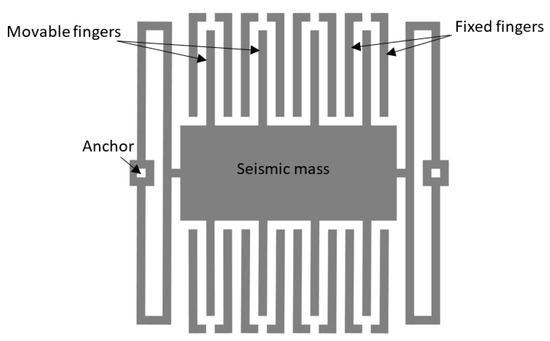 Zimmerman et al. present also an accelerometer structure with self-test capability of duration of less than 2 ms, utilizing electrostatic force to deflect the moving mass as shown in Figure 2 [31]. The generated pulse signal makes the accelerometer behave identically to an external acceleration signal. The amplitude of the deflection is controllable. The self-test is claimed to be useful also for the periodic calibration and accelerated ageing test. Analysis of the test response allows access to the functional parameters of the device, such as the resonance frequency, which is affected by most common accelerometer faults [32,33].