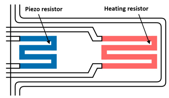 Thermal actuation is utilized for BIST in various ways [34,35]. In one instance, a current is used to thermally expand a bimetallic membrane to simulate membrane deflection in a pressure sensor [27,28]. Charlot et al. use thermal actuation in three applications: (1) a cantilever structure used as a tactile sensor, (2) a cantilever with a suspended mass simulating an accelerometer and a (3) membrane for pressure sensors [24]. In all three cases, a heater electrode is used to provoke the thermally induced deformation of a suspended structure. The magnitude of the deformation is detected by piezoresistors, as shown in Figure 3.