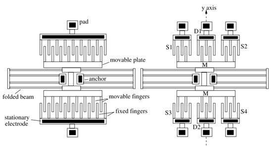 Most of the research related to this method has been carried out at Carnegie Mellon University by Deb et al. [37,38,39,40], and by Xiong at al. at the University of Cincinnati, as shown in Figure 5 [41,42]. While Deb et al. focused on the symmetrical test method only on surface-micromachined capacitive MEMS accelerometers, Xiong et al. showed applied both single-ended and symmetrical test for three different devices and claimed that their technique can be easily extended to other capacitive MEMS devices. With a 1 MHz modulation voltage, the sensing time is under 1 ms. This test method also requires additional circuitry for control and measurement at symmetrically placed areas.