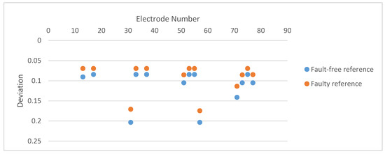 Deviations of impedance ratios. The damaged electrodes are no. 31 and no. 57. Adapted from [52].