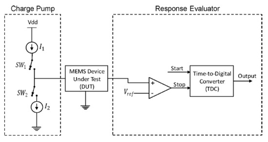 As shown in Figure 10, this BIST scheme utilizes a charge pump with two current sources that gradually charge (current source I1) and discharge (current source I2) the capacitance of a MEMS while measuring the charge and discharge times with delay lines [65]. A comb drive structure was used for testing, thus charging the device altered the electrostatic force between the plates. The movement of the plates results in a capacitance variation that is detected and converted to time intervals using delay lines. The time intervals are digitized by a time-to-digital converter (TDC) [67]. Some structural defects may alter the measured capacitance of the comb drive by changing its geometry and spring constant. These defects can include missing fingers, finger dimension dissimilarity and etch variation.