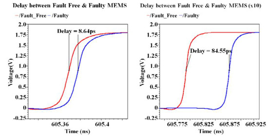 In the study of Rashidzadeh et al., the resonance frequency of the DUT depends on the MEMS capacitance. As shown in Figure 13, a 10 fF change in a capacitance of a comb drive structure with a nominal value of 1 pF creates a 10 MHz deviation of a resonant frequency of 1 GHz, which is much easier to detect than the corresponding deviation in the time domain. This BIST duration is in the order of ns and the method is able to detect structural failures with high accuracy, such as missing fingers in a comb-drive.
