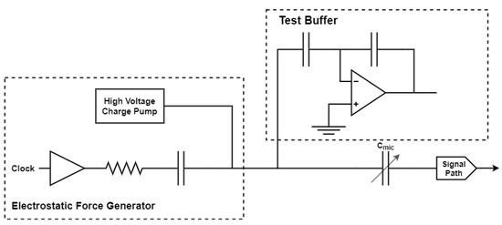 A patent from InvenSense Inc. describes an on-chip pulse excitation (PE) solution for testing a capacitive microphone as shown in Figure 14 [73]. The electrical pulse is generated by an electrostatic force generator. The circuit includes a voltage buffer to drive the test signal onto the output of a high voltage charge pump (HVCP). The output of the voltage buffer is coupled through a capacitor so that it does not disturb the DC voltage at the output of the HVCP. A resistor is used to control the time constant of the applied waveform.