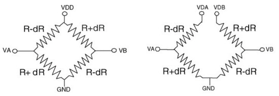 The differential bias method relies on device symmetry to identify structural defects. In the case of a pressure sensor, a Wheatstone bridge structure, Figure 17, is used with piezo resistive strain gauges experiencing increase and decrease of resistance depending on the applied strain [82]. The voltage supply of the structure is split into two differential inputs containing the bias voltage and an ac signal of different polarity but same magnitude. The AC output is independent of the strain applied to the structure as the values of the resistors stay relative to each other along with the rate of change. If the change only affects a single resistor, the AC output will change, and the fault is detected.